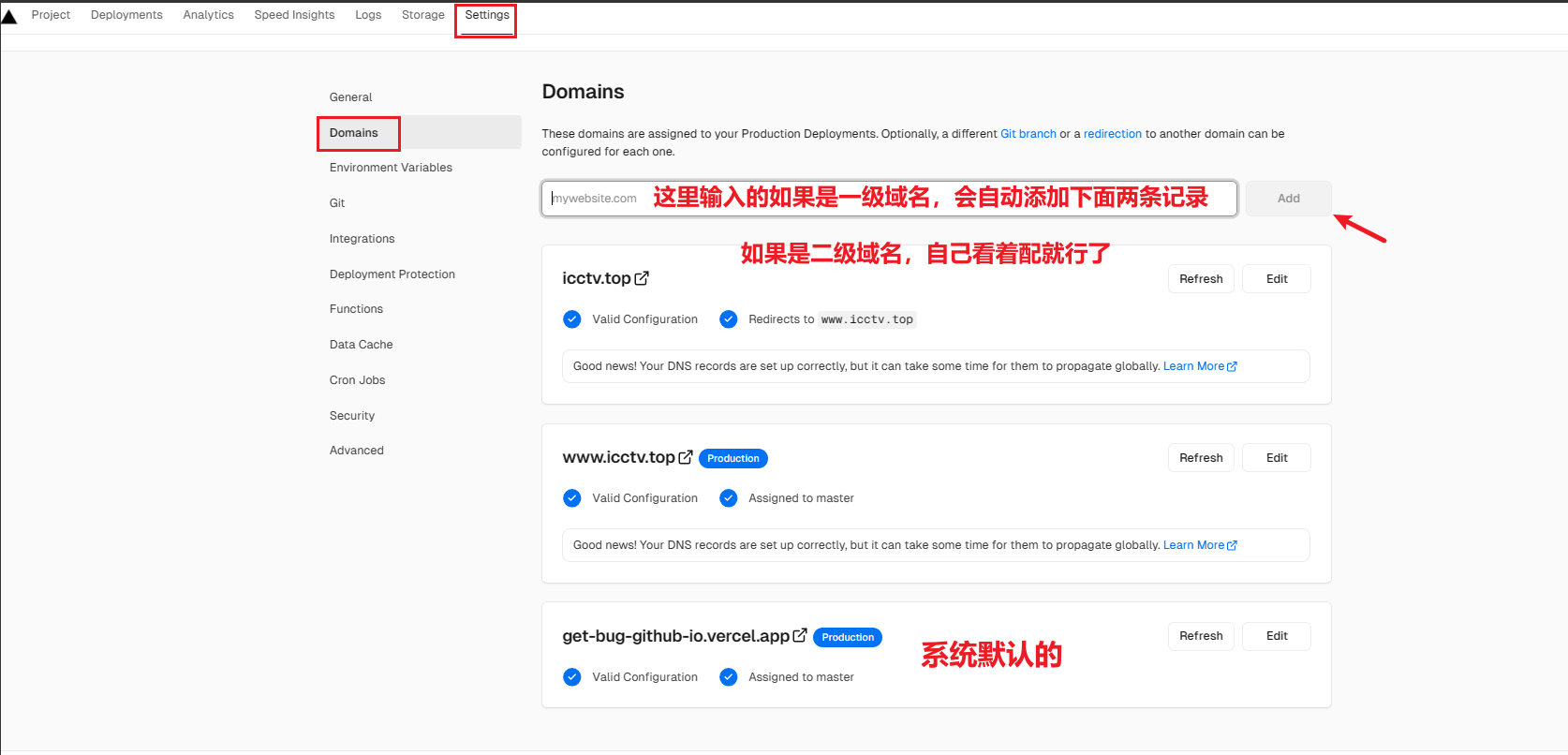 导入项目后,进入Setting页面,添加自定义域名。默认会生成一个 *.vercel.app的域名,输入你的域名,点击添加即可。一级域名会自动添加一条www记录,二级域名需要自己配置。