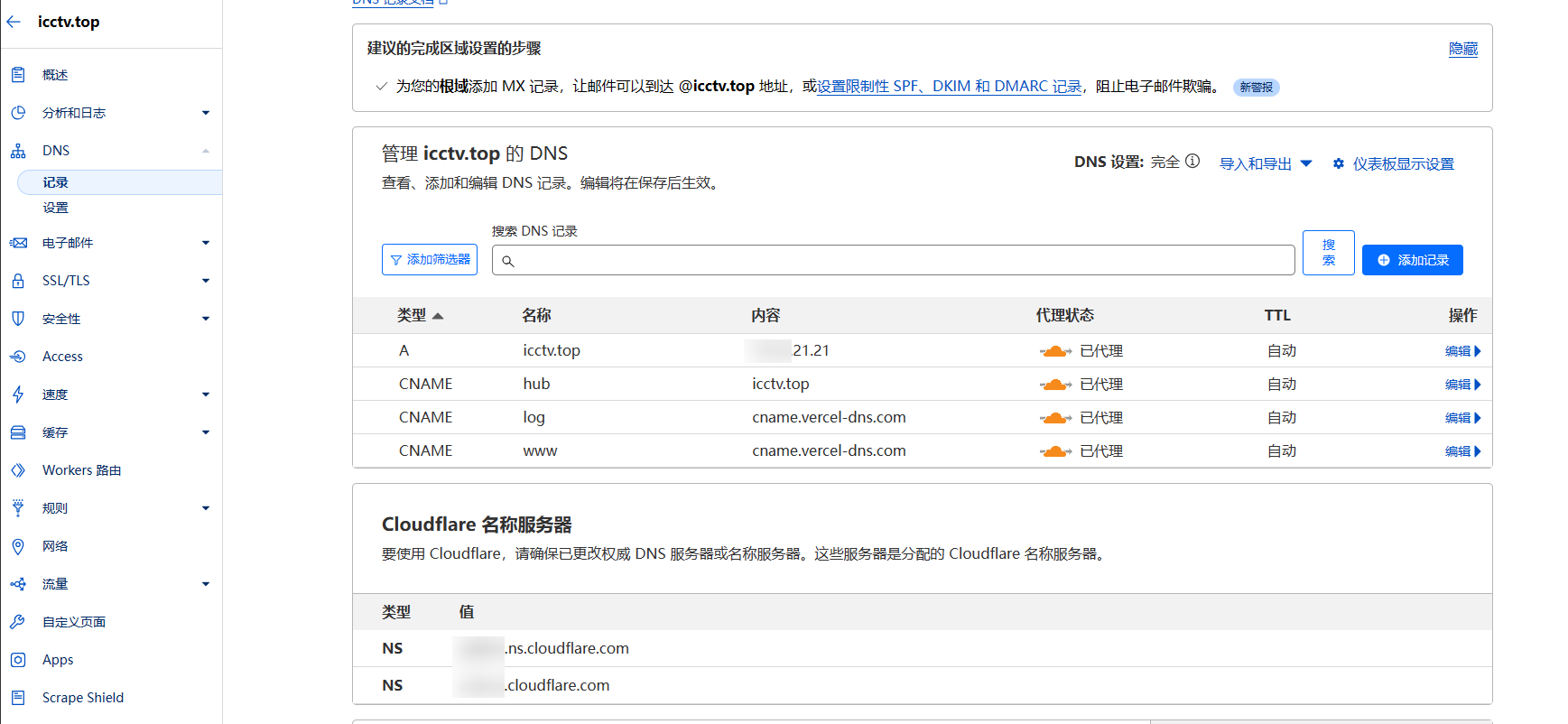 1、按步骤注册cloudflare完成,添加一个网站(有域名即可),进入该站点,添加vercel的解析记录,添加完回到vercel查看是否成功。