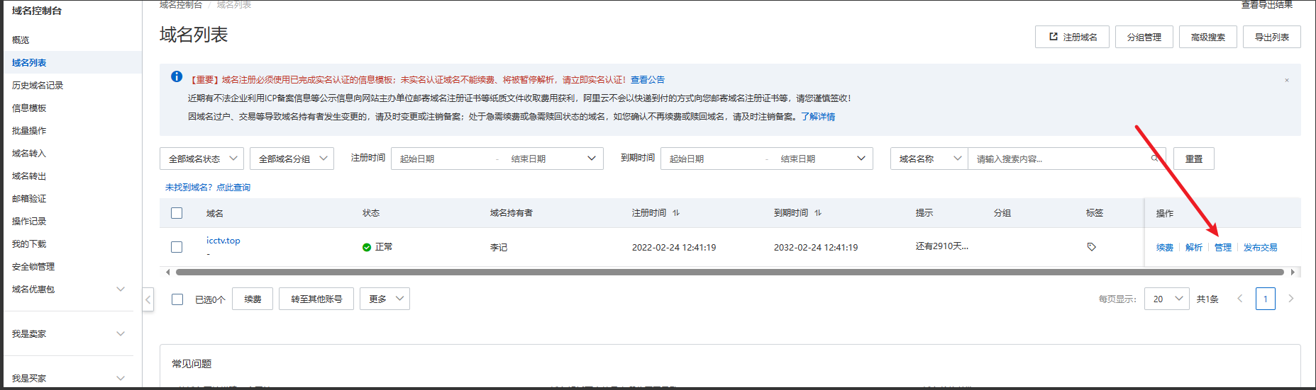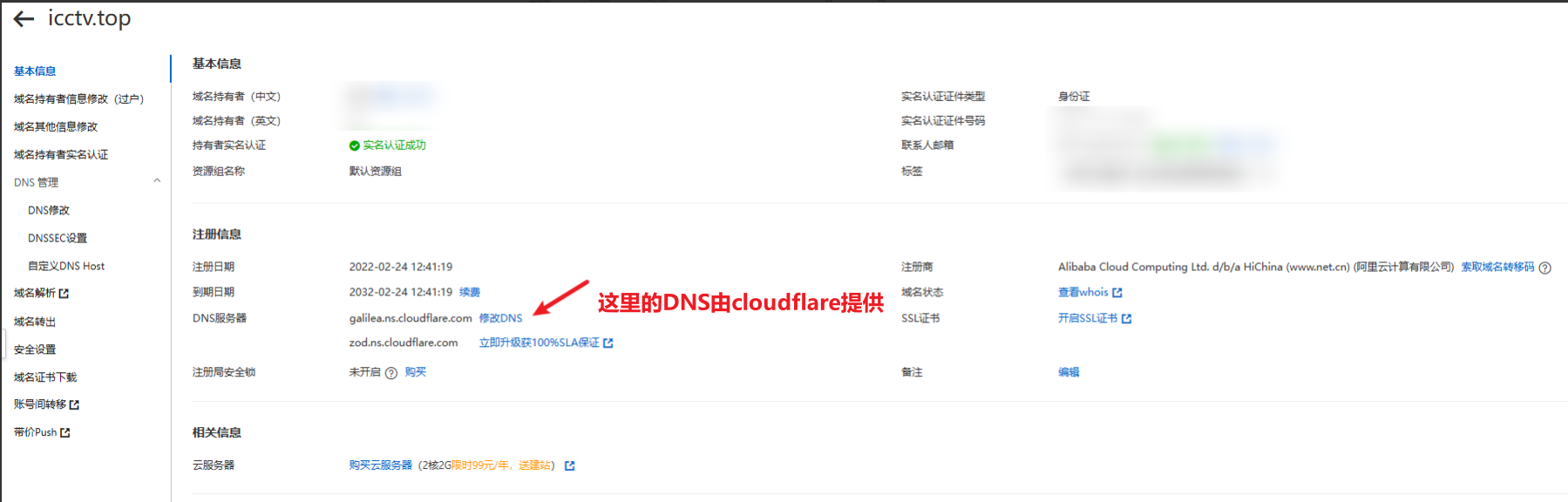 2、如果你是阿里云等国内厂商购买的域名,需要将域名解析厂商转移到cloudflare,例如阿里云: